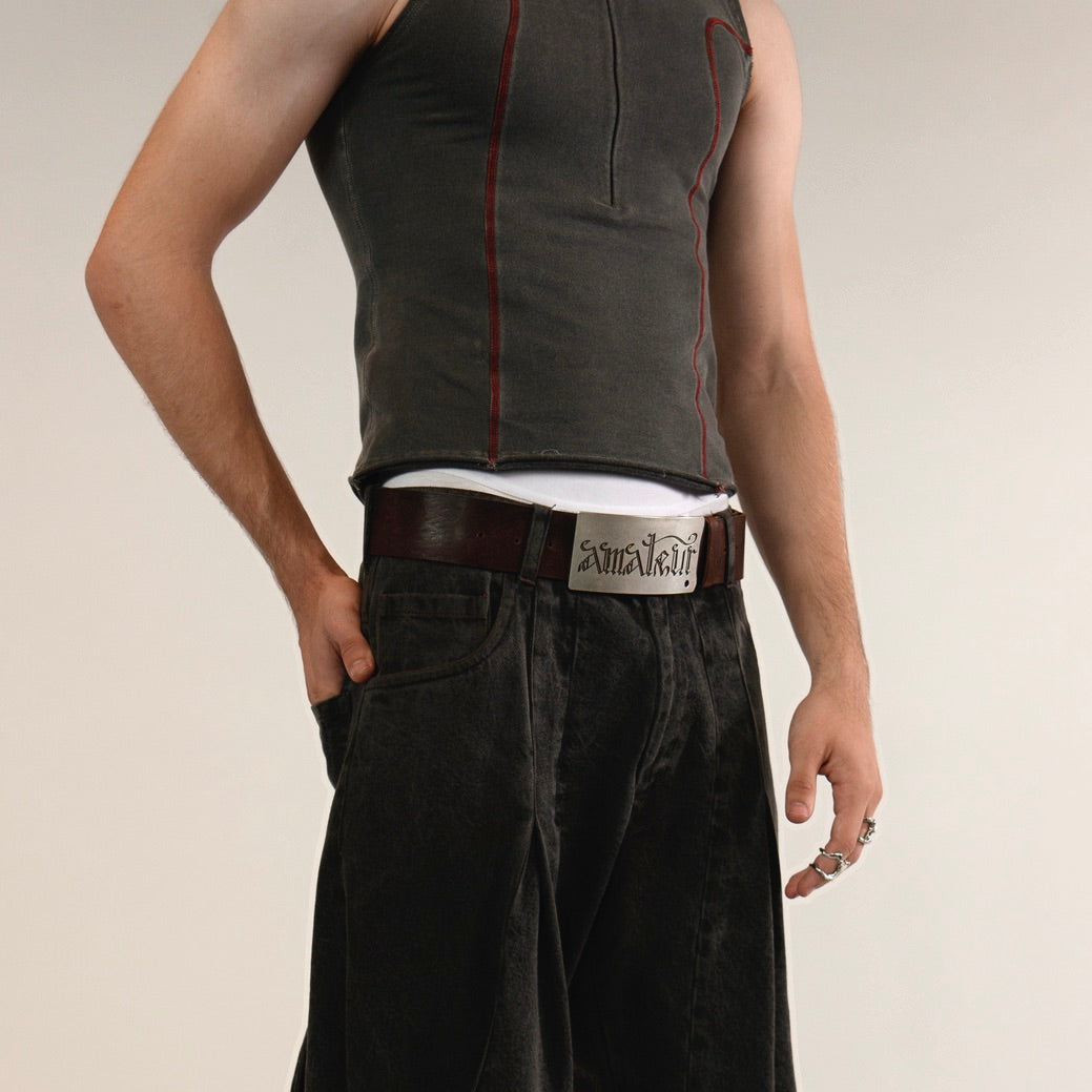 Brown leather belt featuring a silver brass buckle engraved with "amateur". The durable material and sleek design provide both style and functionality.