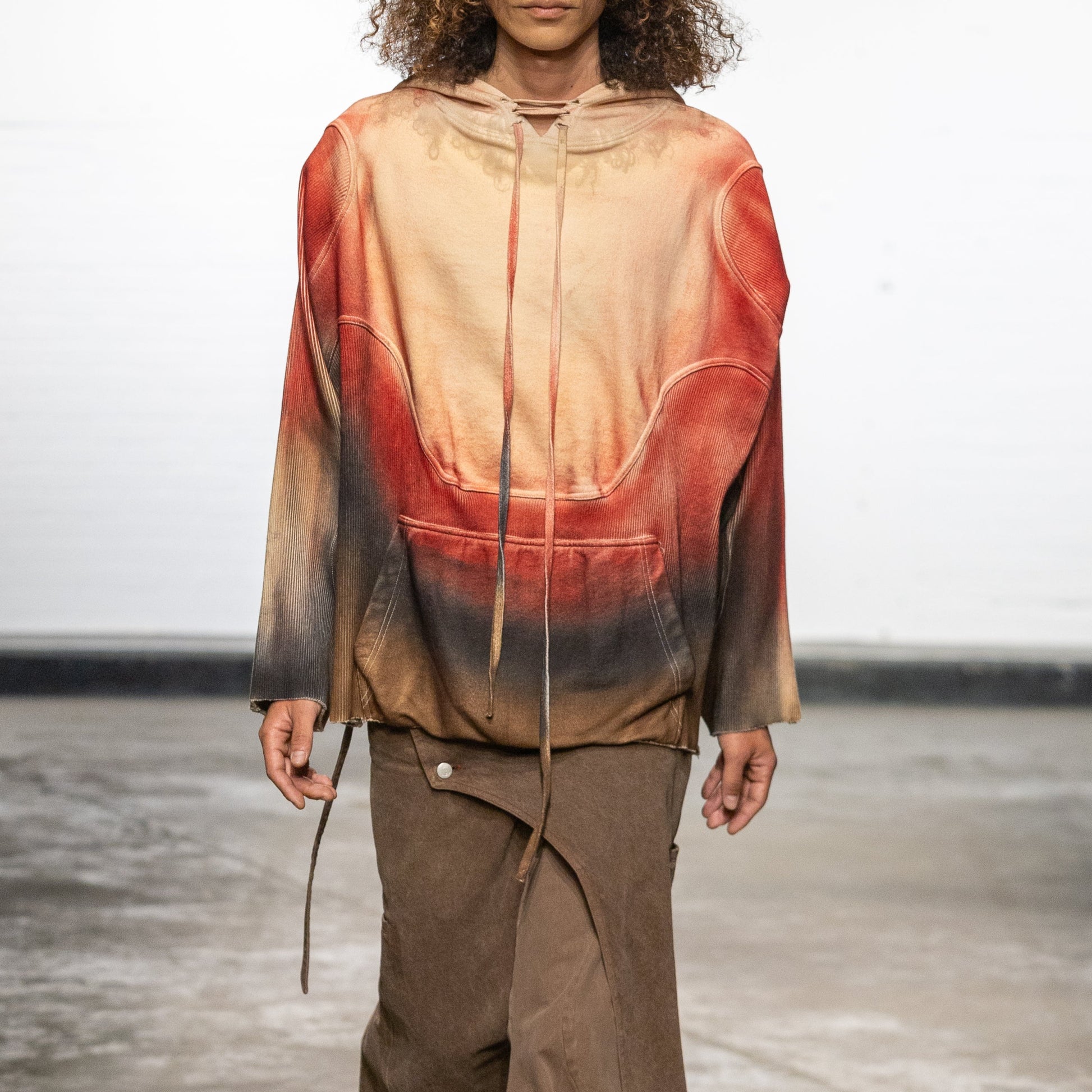 Our oversized medieval armour-inspired hoodie in airbrushed tonal red. Constructed from heavy cotton jersey and rib, with lace detailing on the hood.