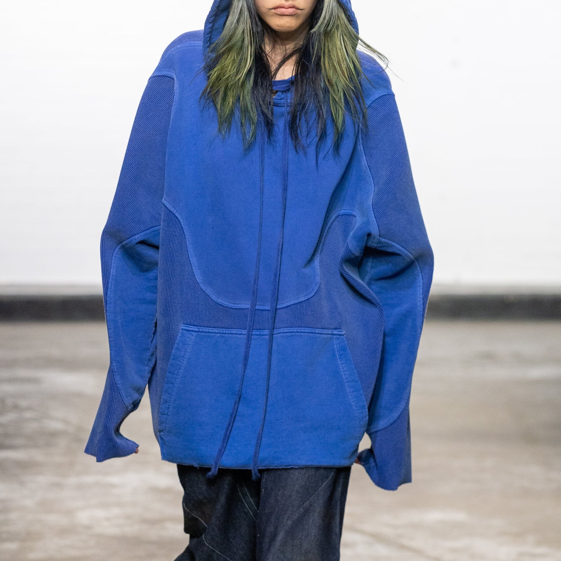 Our oversized medieval armour-inspired hoodie in vibrant blue. Constructed from heavy cotton jersey and rib, with lace detailing on the hood.