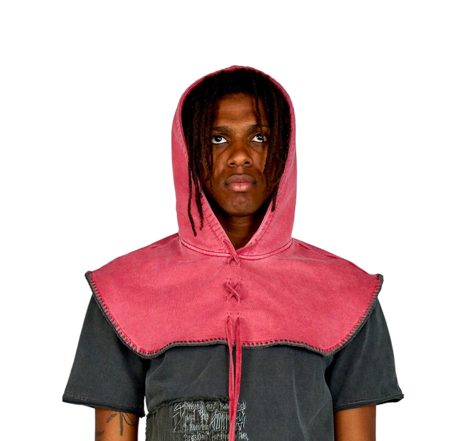 The Chaperon pointed Hood in Red is made with 100% Cotton featuring scallop stitching and laced up detail for adjustment.