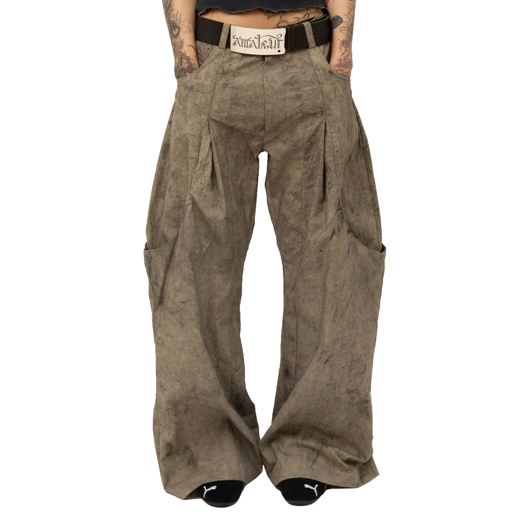 Wax-coated cargos dyed with a dirty effect beige colour. Featured oversized pockets and pleat details.