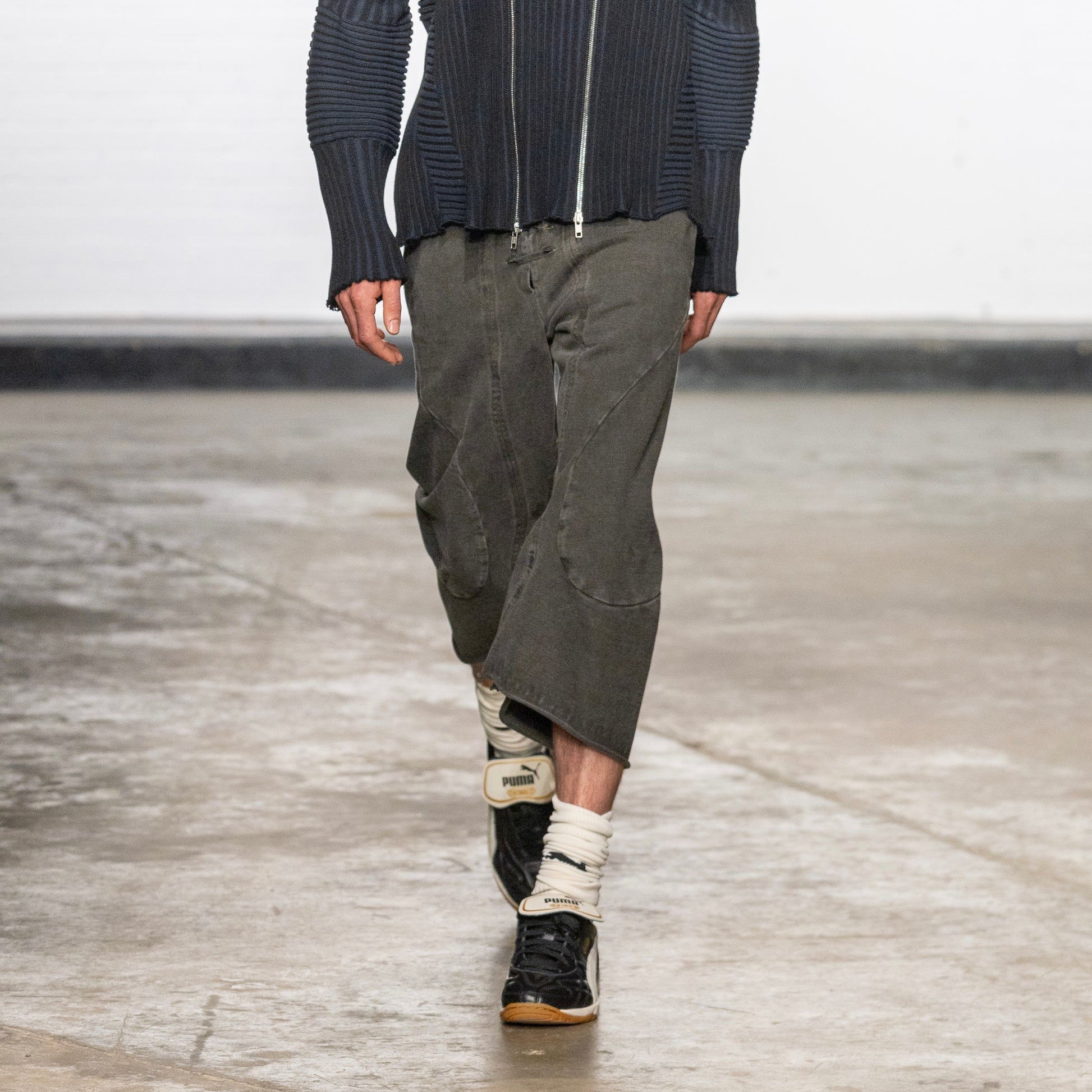 The Cropped Engineered Joggers in Charcoal are made from 100% cotton, featuring an articulated shape for a comfortable fit.