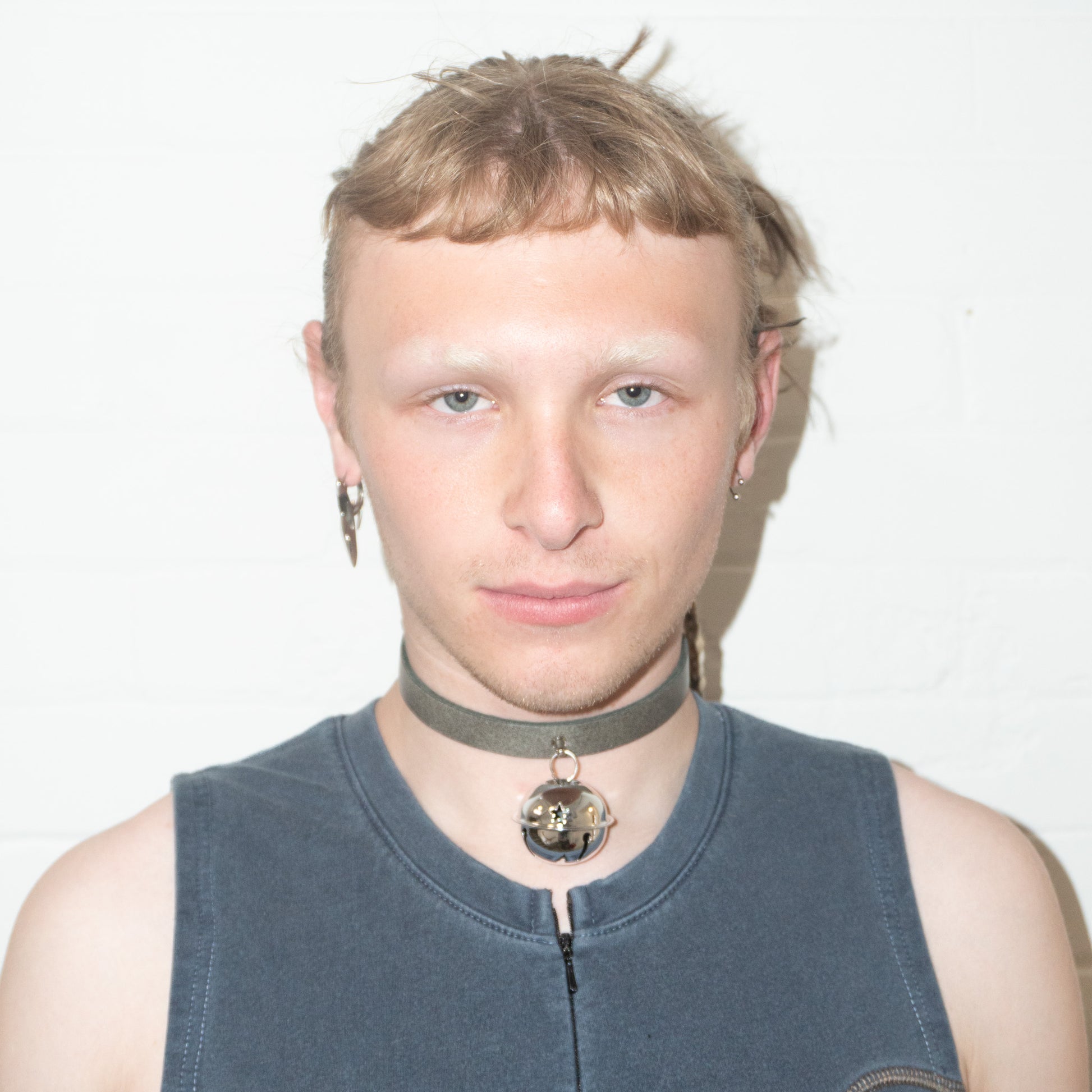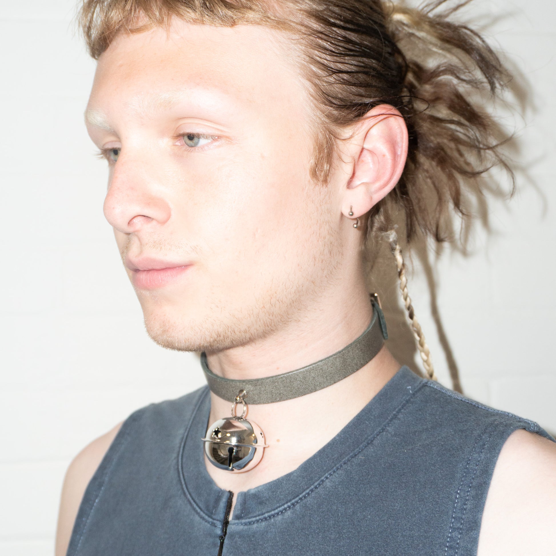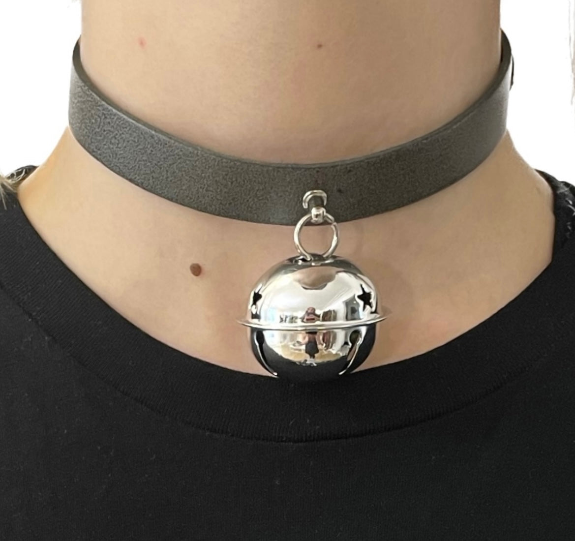 Our Joker Choker is made out of grey leather with a black bell feature adjustable with a buckle fastener.