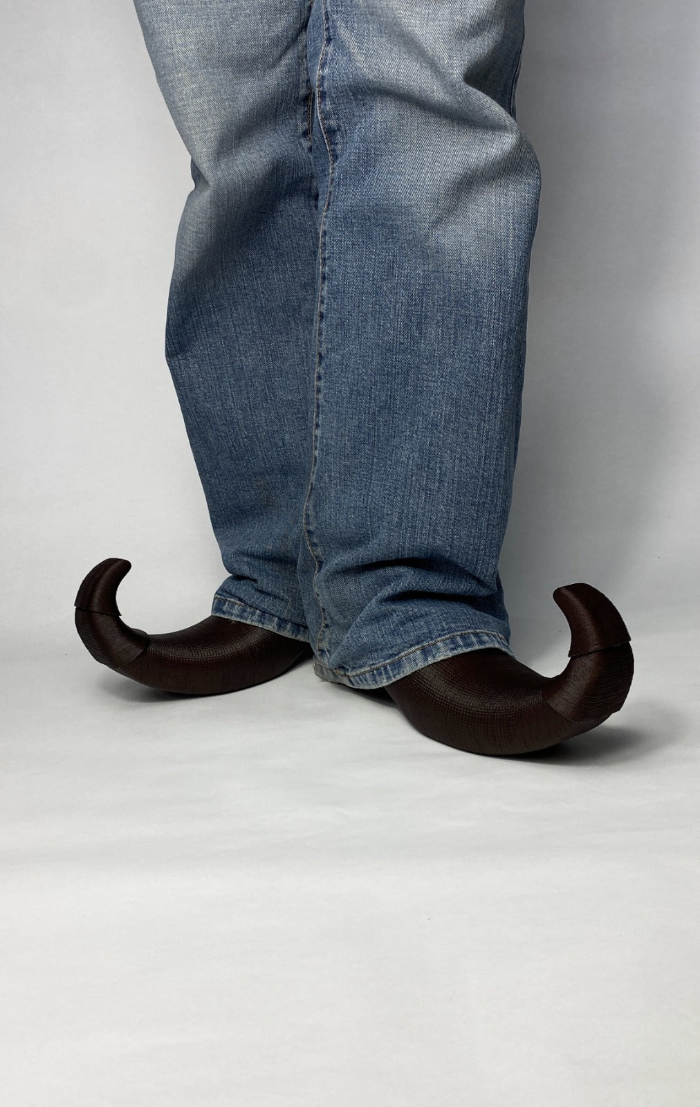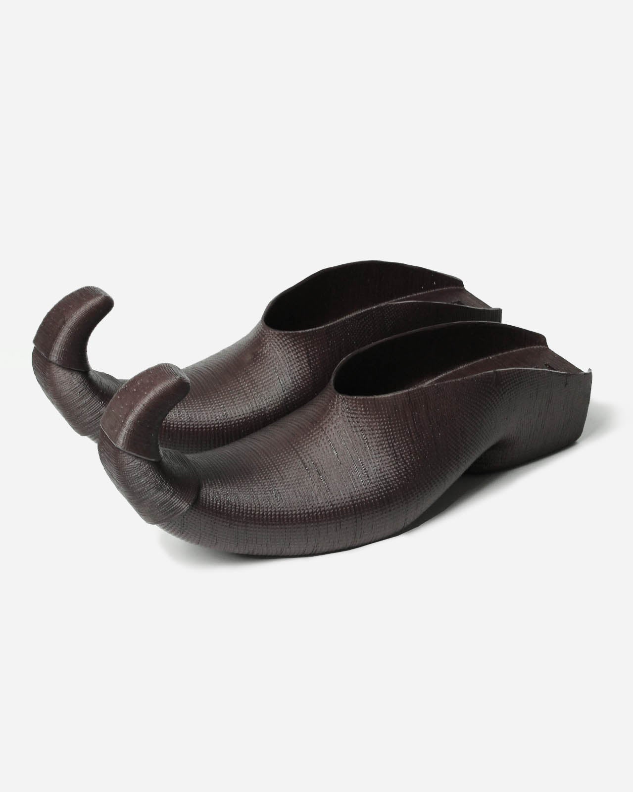 Curled toe mules in dark mahogany inspired by medieval Polaines, designed by Lueder in collaboration with Body Amplification Devices. Crafted using advanced 3D printing technology.