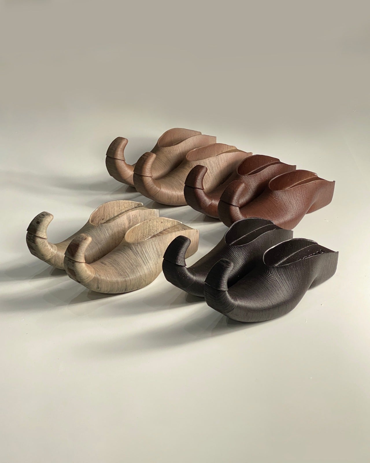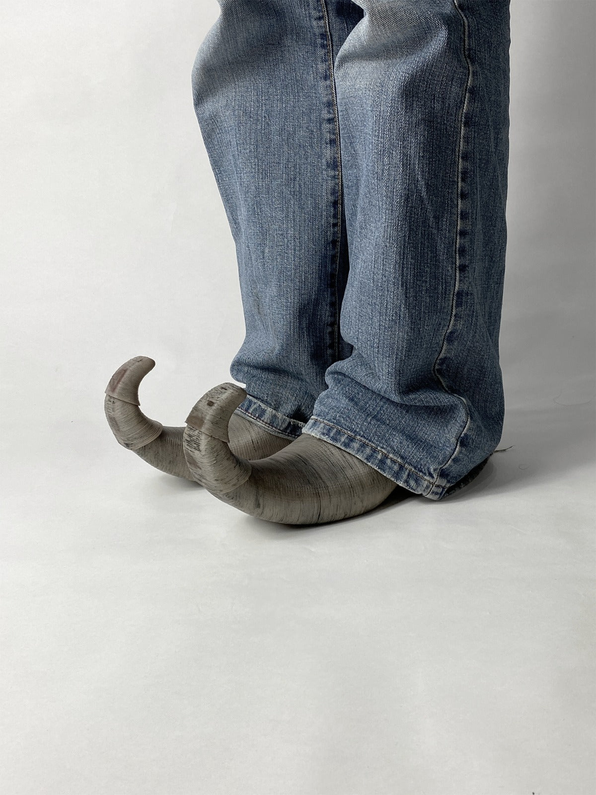 Curled toe mules in colour bone inspired by medieval Polaines, designed by Lueder in collaboration with Body Amplification Devices. Crafted using advanced 3D printing technology.