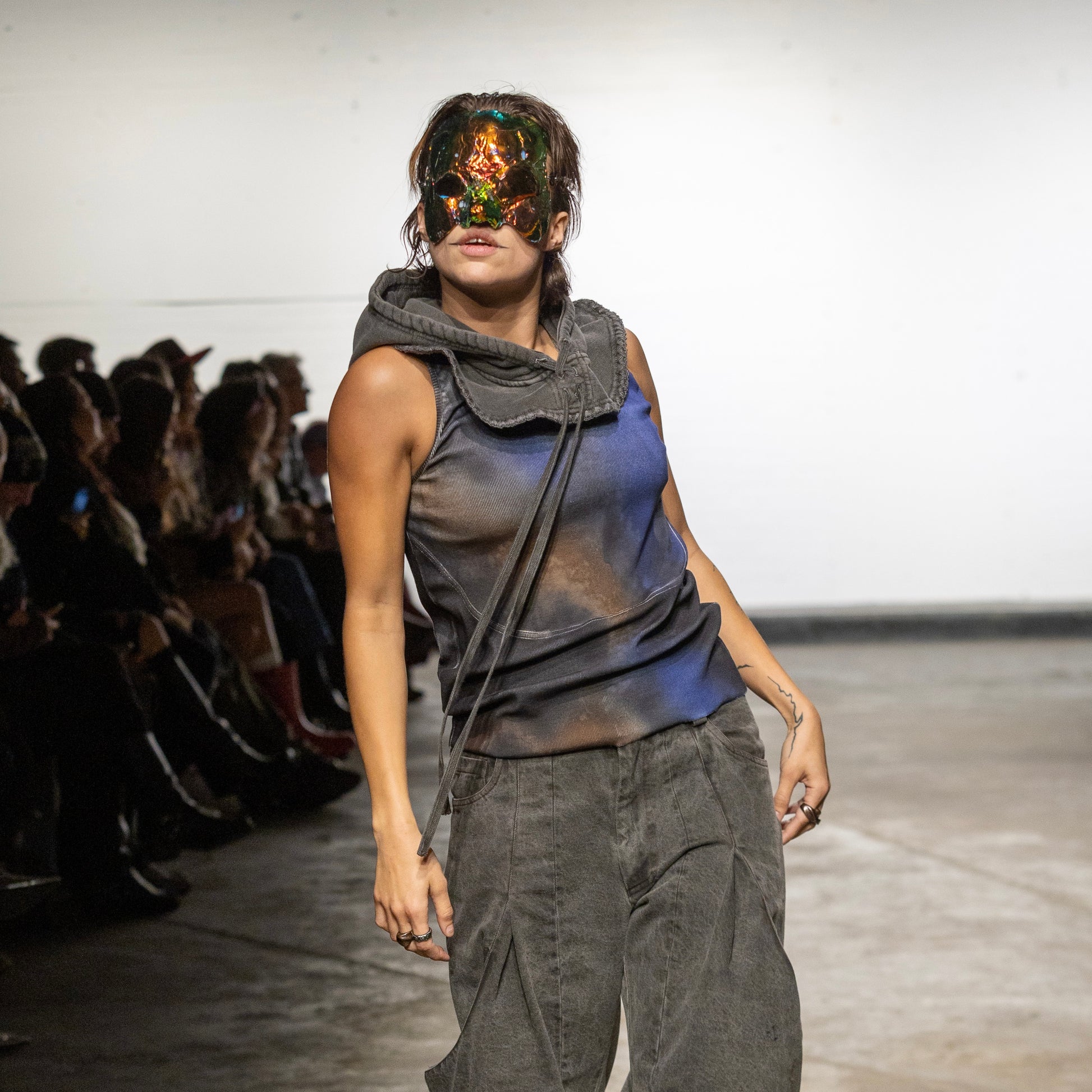 Stays Tank Multi Blue with brown details is made with 100% cotton rip, featuring an airbrushed design for a unique touch.