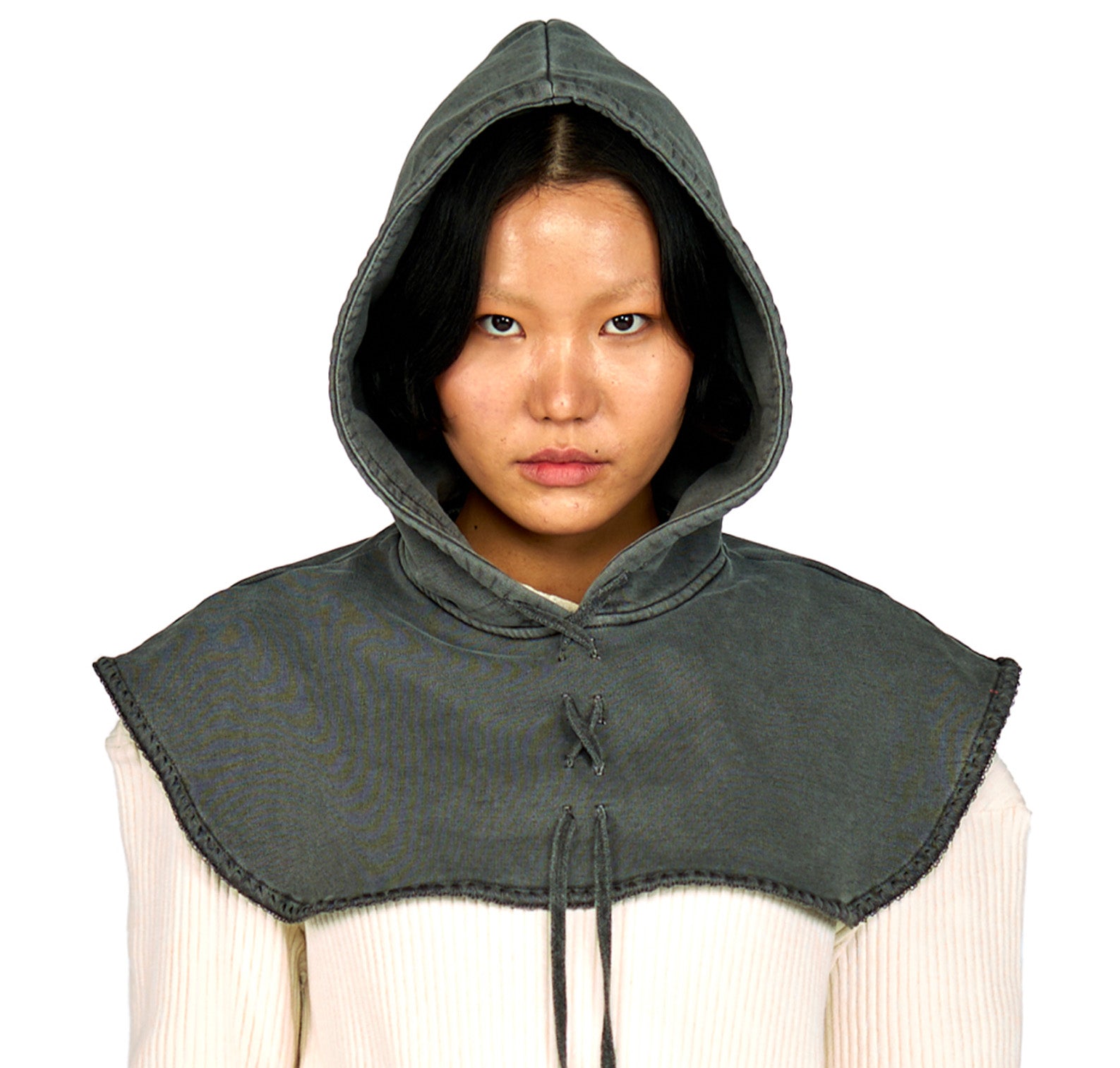 The Chaperon pointed Hood in Charcoal is made with 100% Cotton featuring scallop stitching and laced up detail for adjustment.